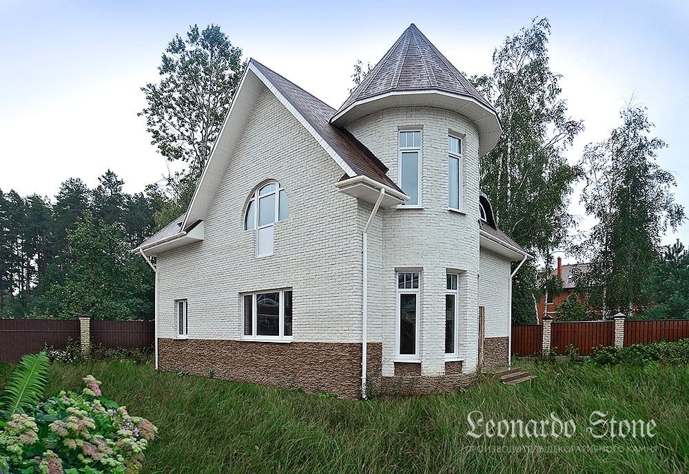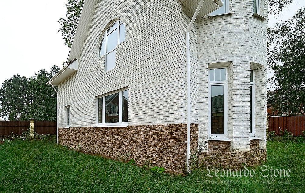 Стены этого дома облицованы декоративным кирпичом «Авиньон 100», который благодаря своей фактуре отлично передаёт королевский шик и дух старины, а цоколь украшает искусственный камень коллекции «Перуджа» в цвете 709.