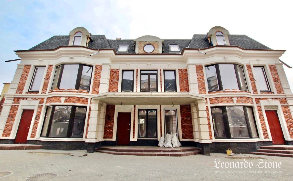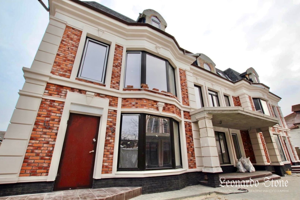 Чтобы сделать этот дом непохожим на другие, для облицовки был выбран наш декоративный кирпич коллекции «Орли» в цвете 490, ставший отличным фоном для архитектурного декора.